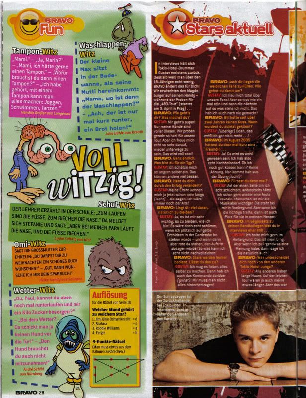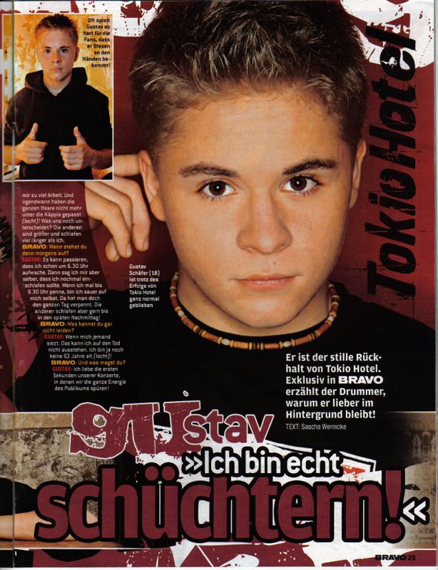 Sokk utn mg egy kis friss. NRJ-s kpek s a nmet Bravo. N tkre rlk, hogy vgre van Gustavval is egy normlis interj. Szerintem Georggal is lesz a jv hten. Szval holnap rlhetnek a Gustav fanok mert a fordtsa fent lesz.